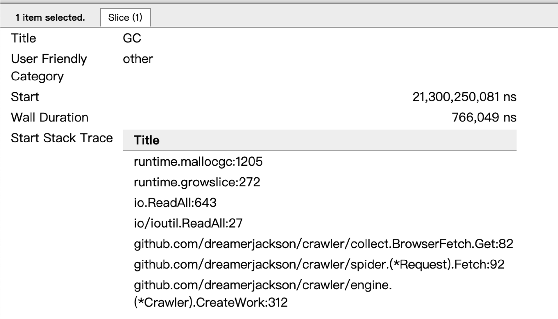 - 观察内存的使用情况,可以看到内存的占用很小,只有不到8MB。但内存的增长表现出了锯齿状。进一步观察,我们发现在60s内,执行了6次GC。点击触发GC的位置,会发现触发GC主要来自于ioutl.ReadAll函数。