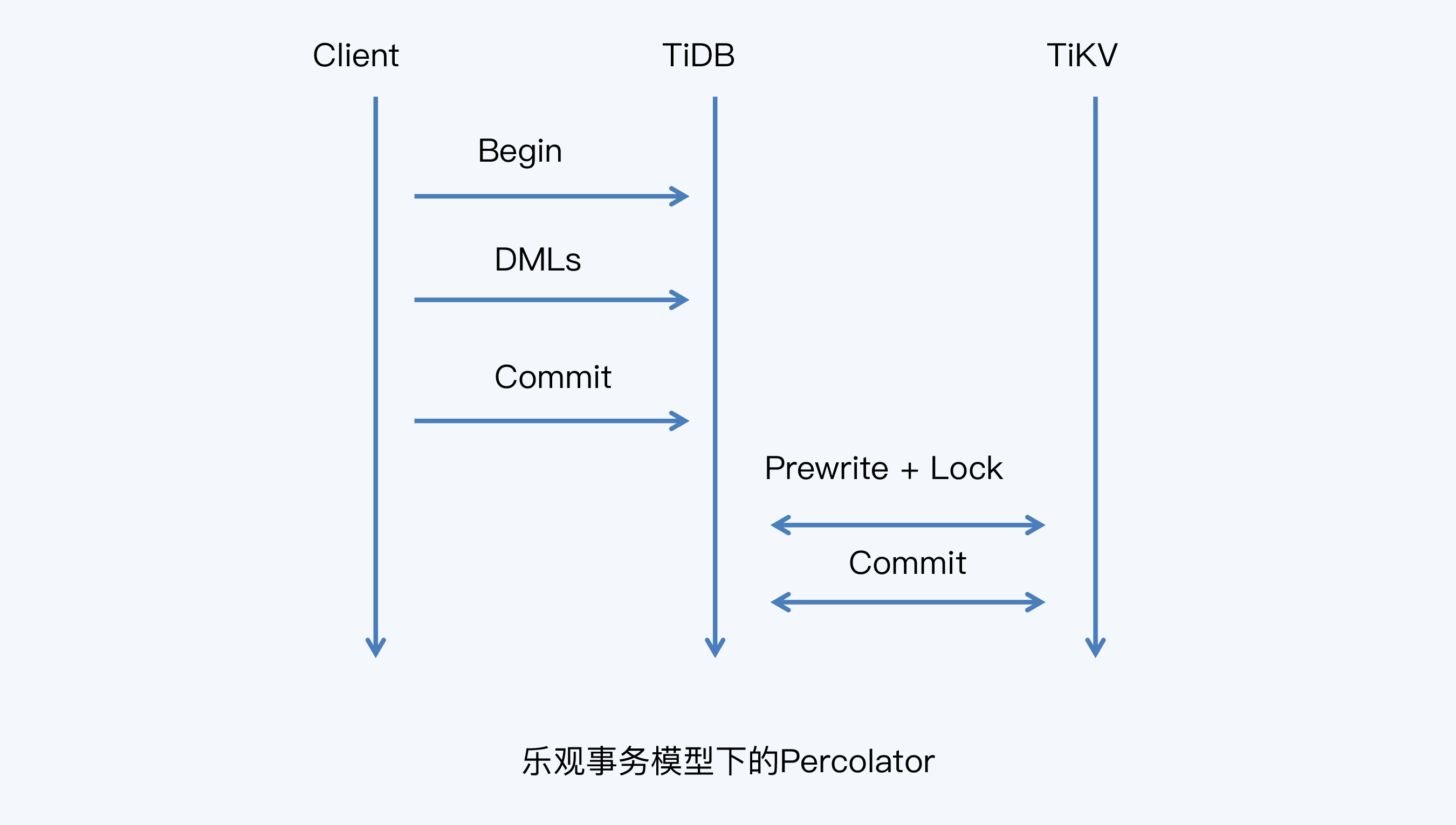TiDB的乐观锁基本上就是Percolator模型,这个模型我们在[第9讲]时曾经介绍过,它的运行过程可以分为三个阶段。