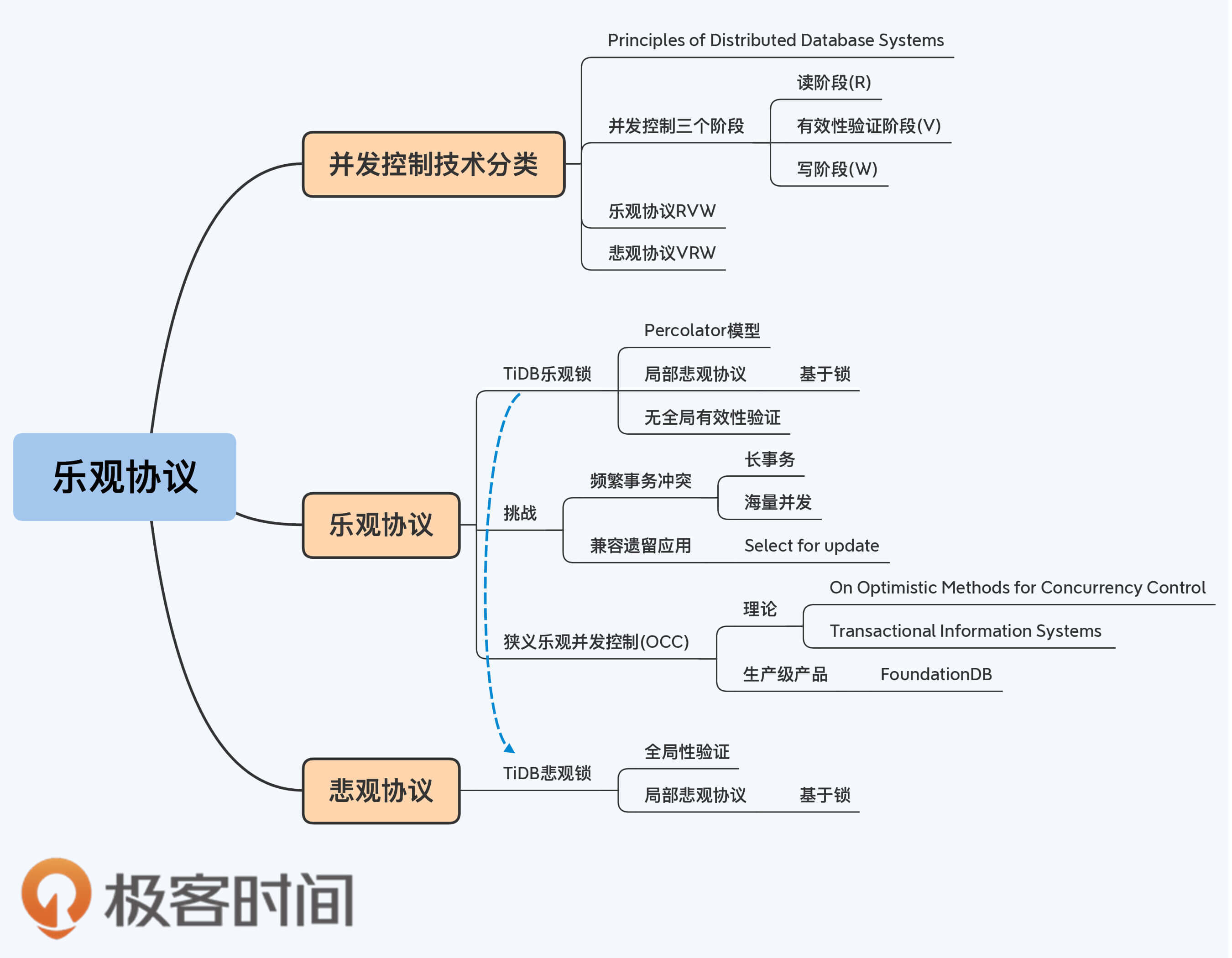这个定义是一个更加具体的乐观协议,严格符合RVW顺序,所以我把它称为狭义上的乐观并发控制(Optimistic Concurrency Control),也称为基于有效性确认的并发控制(Validation-Based Concurrency Control)。很多学术论文中的OCC,就是指它。而在工业界,真正生产级的分布式数据库还很少使用狭义OCC进行并发控制,唯一的例外就是FoundationDB。与之相对应的,则是TiDB这种广义上的乐观并发控制,说它乐观是因为它没有严格遵循VRW顺序。