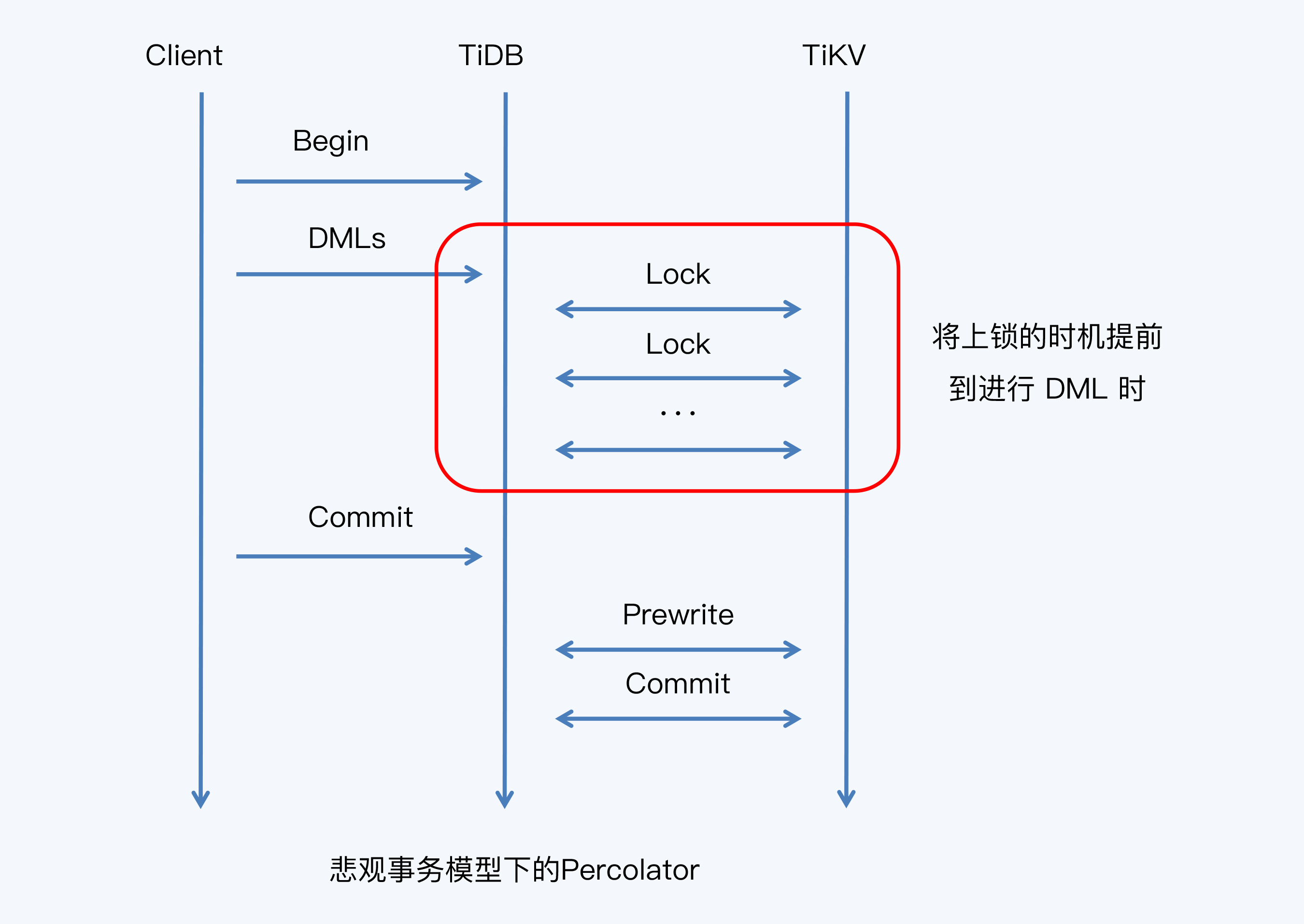 因为上面这些挑战,TiDB的并发控制机制也做出了改变,增加了“悲观锁”并作为默认选项。TiDB悲观锁的理论基础很简单,就是在原有的局部有效性确认前,增加一轮全局有效性确认。这样就是严格的VRW,自然就是标准的悲观协议了。具体采用的方式就是增加了悲观锁,这个锁是实际存在的,表现为一个占位符,随着SQL的执行即时向存储系统(TiKV)发出,这样事务就可以在第一时间发现是否有其他事务与自己冲突。