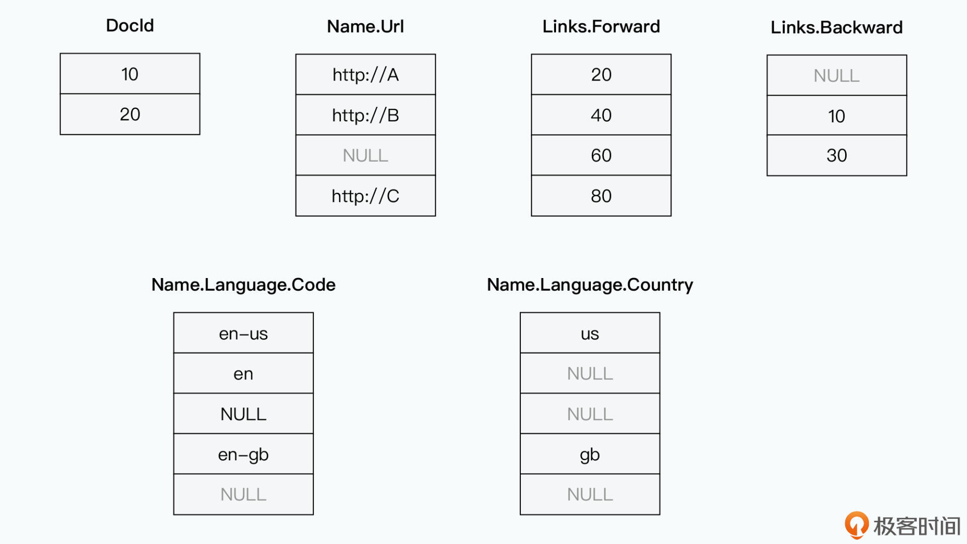 但是在现在这个,一行数据的一个列,可能有多条数据。如果我们把每个字段的数据都按列存储,那么不同列的数据行数就不一样多了。比如,我把论文里图2的r1和r2两条数据,都按列存放下来,那么你能看得出来,Links.Backward的第三个值到底应该是在哪条记录里吗?