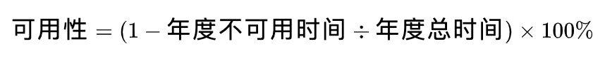 首先我们看下,什么叫做应用的高可用,以及可用性如何度量。业界通常用多少个9来说明互联网应用的可用性。比如说淘宝的可用性是4个9,就是说淘宝的服务99.99%可用。这句话的意思是,淘宝的服务要保证在所有的运行时间里只有0.01%不可用,也就是说一年大概有53分钟不可用。这个99.99%就叫做系统的可用性指标,这个值的计算公式是: