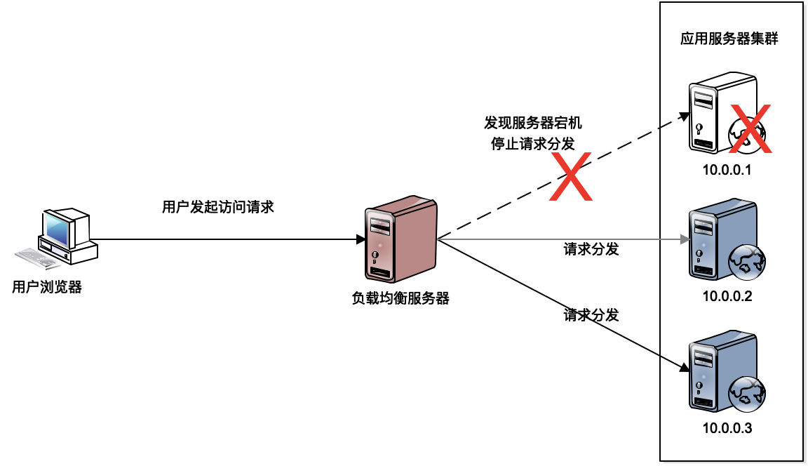 负载均衡服务器通过心跳检测发现集群中某台应用服务器失效,然后负载均衡服务器就不将请求分发给这台服务器,对用户而言,也就感觉不到有服务器失效,系统依然可用。