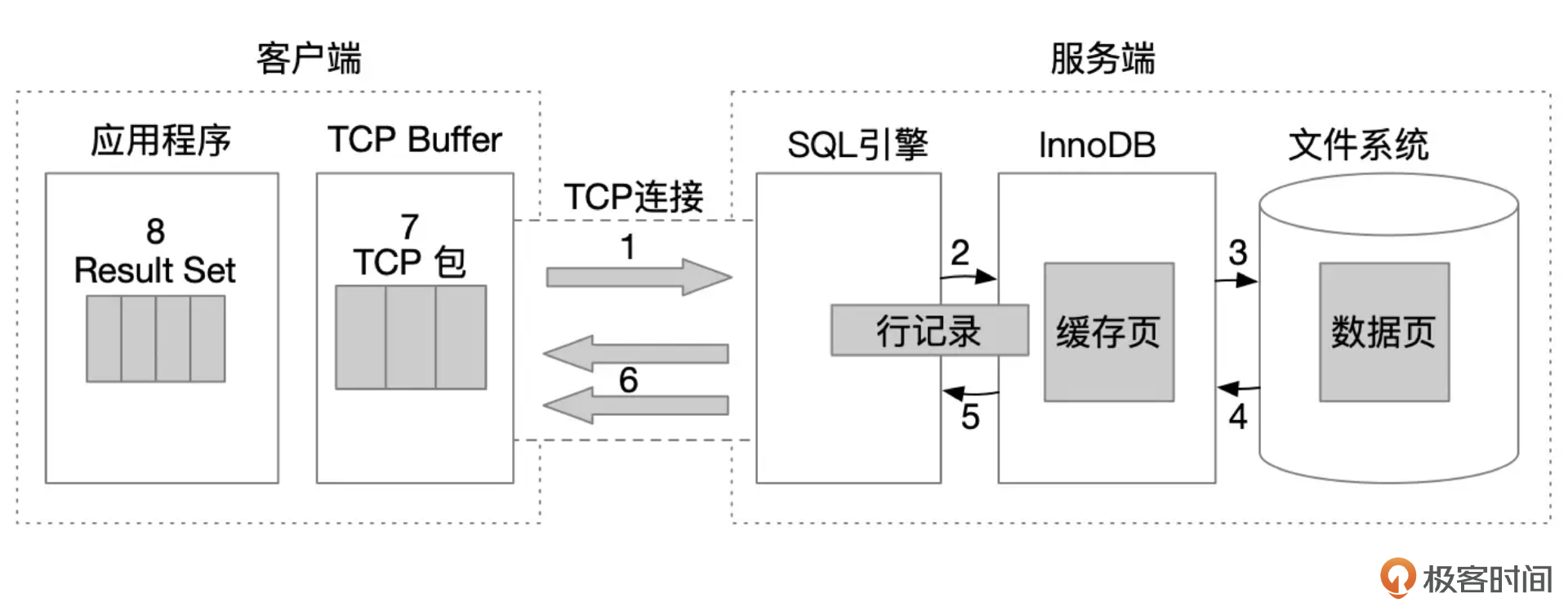 - 数据库服务端接收到客户端发起请求,解析SQL文本,生成执行计划,并开始执行SQL语句。执行时,需要到存储引擎获取数据。