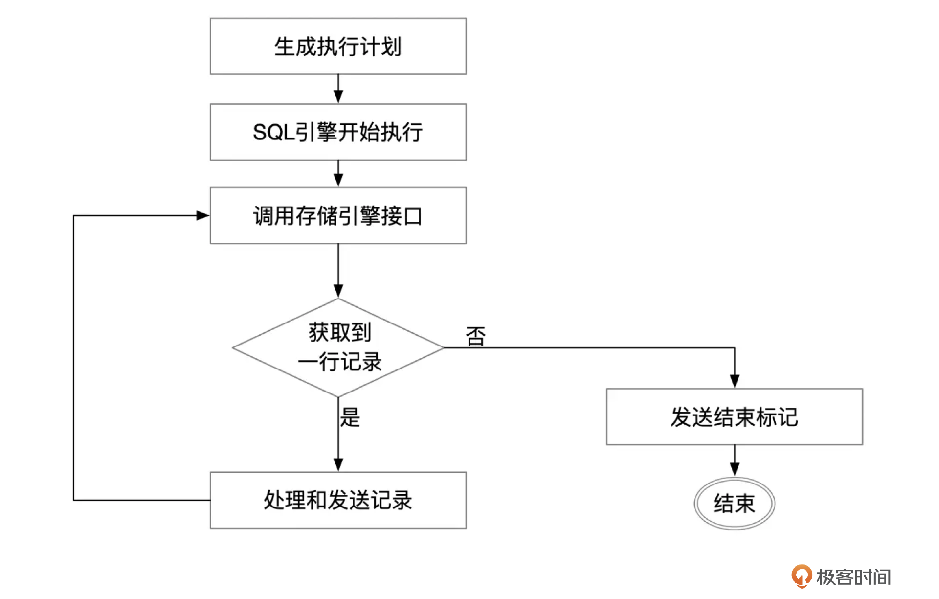 MySQL优化器生成的执行计划,交给SQL引擎执行。SQL引擎的核心是一个大的循环,根据执行计划中的步骤,从表或索引中获取数据。在最简单的情况下,查询只涉及一个表,SQL引擎调用存储引擎接口,如果正常地获取到了记录,就把记录打包,发送给客户端,然后再继续调用存储引擎接口,获取下一行记录。处理完所有记录后,发送OK_Packet,告诉客户端所有数据都已经发送完成。