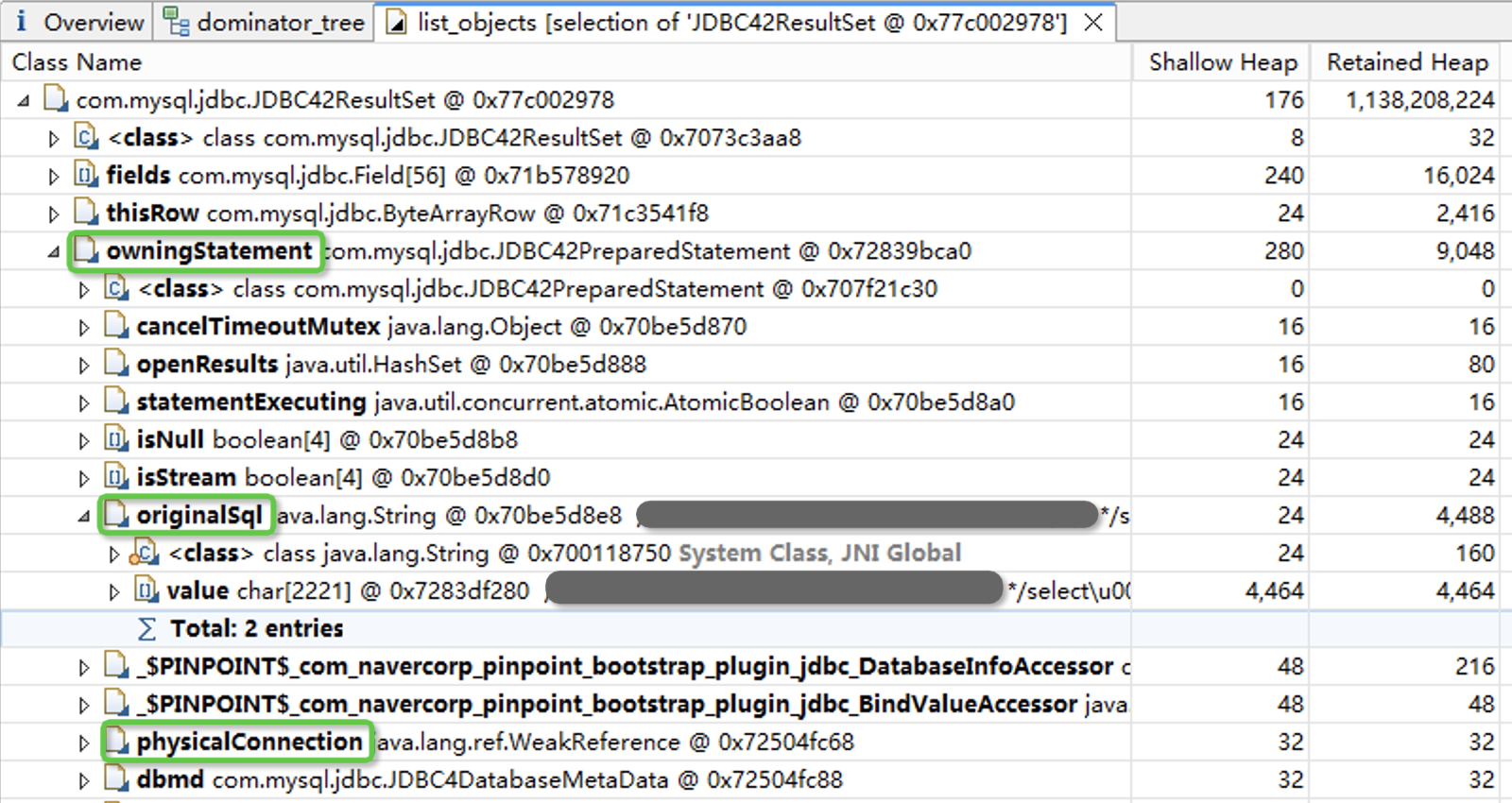 打开Dump文件后,从总览页面可以看到内存消耗最高的那些对象。在我们这个Dump文件中,内存占用最高的是JDBC42ResultSet,从名字我们猜测这应该是从数据库取回的结果集。