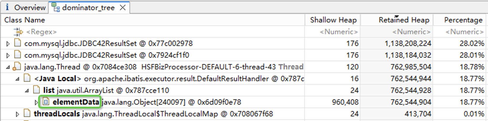 Thread对象也占用了比较多的内存,展开后可以看到其中也有一个长度为20多万的elementData数组,elementData里面存的是业务的对象,跟数据库中的记录相对应。