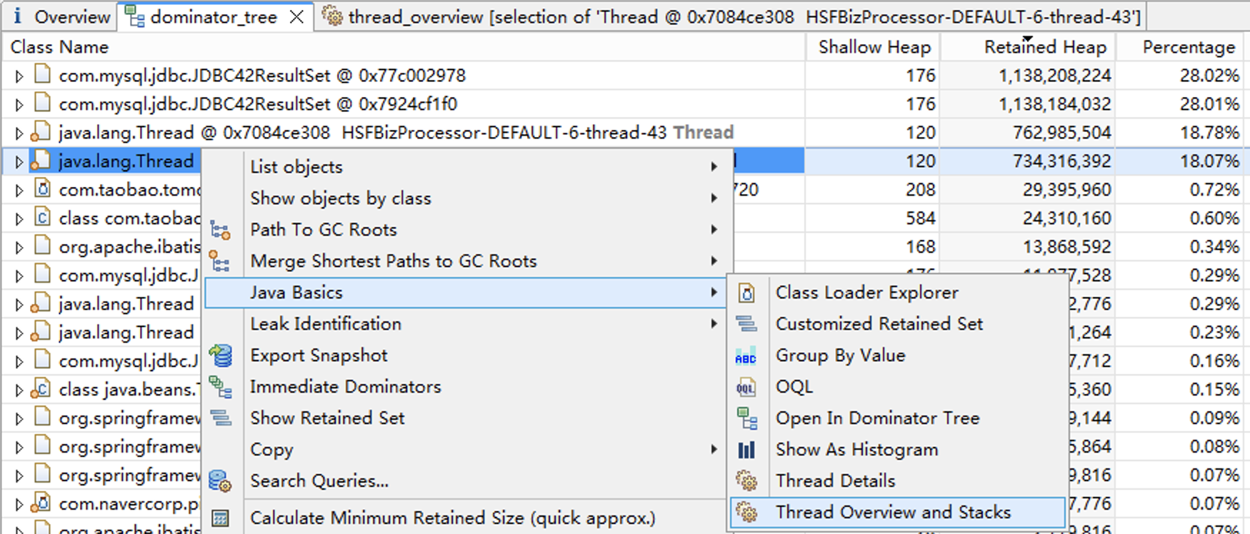 为了分析这些对象是哪个SQL查询得到的,我们需要分析线程的调用栈,打开“Java Basics”下的“Thread Overview and Stacks”菜单。