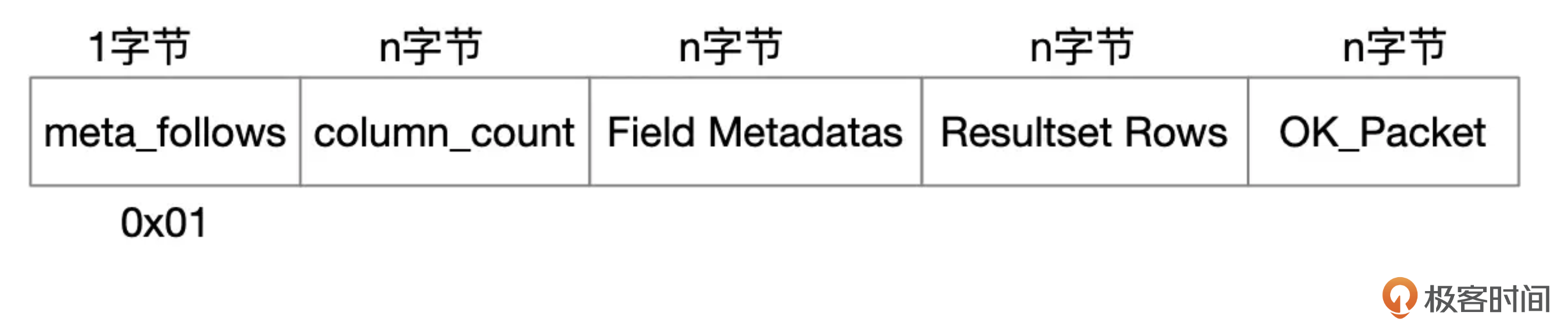 结果集数据包由元数据、行记录、结束标记这几部分组成。元数据实际上是一个字段列表,告诉你返回的数据由哪几个字段组成。行记录从数据库中查询得到,结果集中可能包含0行或多行记录,每行记录由多个字段组成。