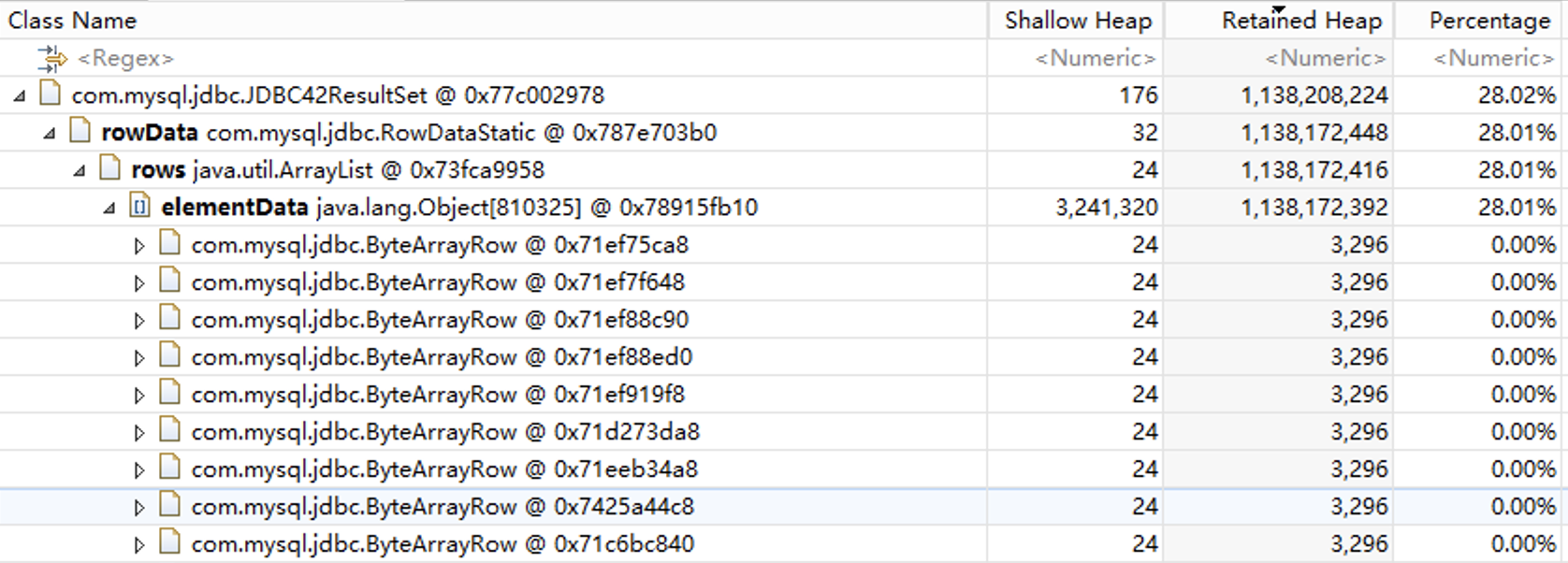 展开对象,我们发现JDBC42ResultSet内存使用这么高的原因是里面有一个elementData数组,这个数组里有80多万个对象,我们猜测这些对象对应数据库返回的记录。
