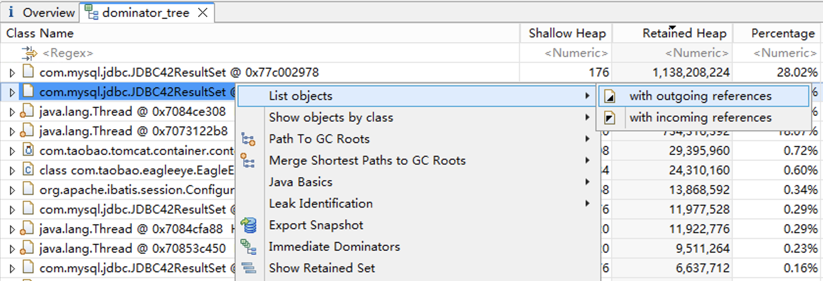 进入Dominator Tree模块,查看内存占用最高的对象。这里我们主要关注的是Retained Heap这一列,也就是对象本身加上该对象引用的其他对象占用的内存总和。我们的Dump文件中,主要是JDBC42ResultSet和Thread对象,总共占用了超过90%的内存。