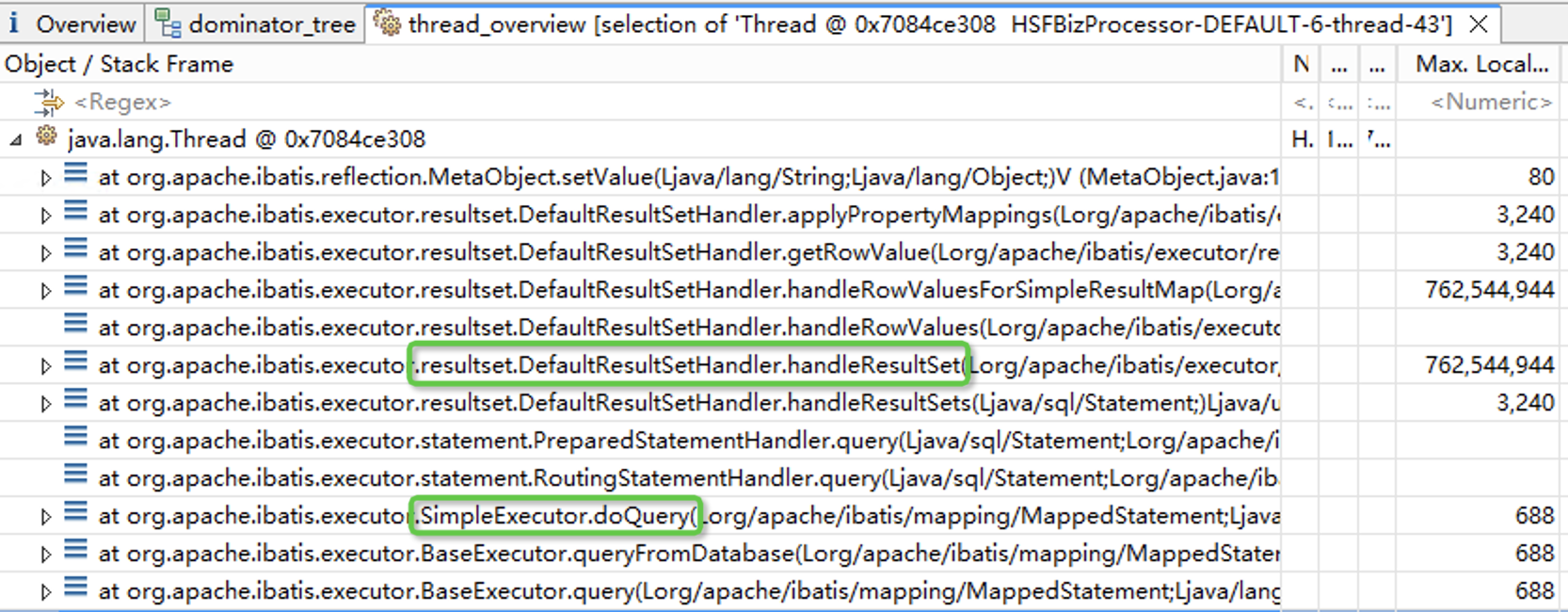 在thread_overview菜单页中,我们可以看到线程的调用栈。内存主要由handleResultSet的局部变量占用,而SQL语句可能是在SimpleExecutor.doQuery方法中发起的。