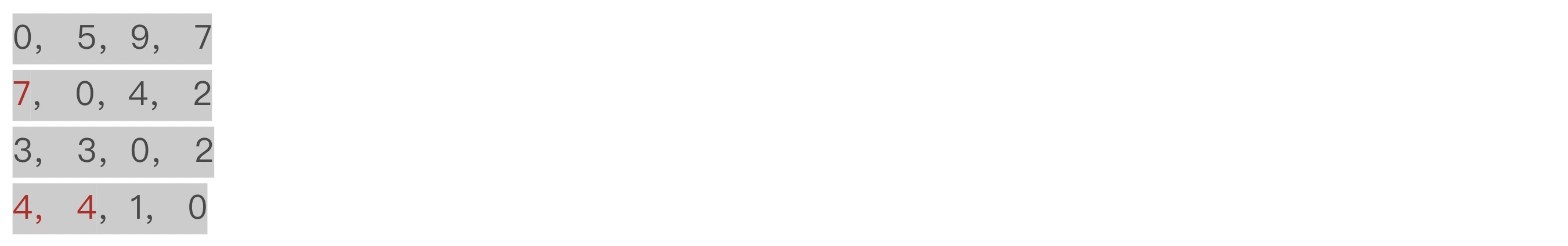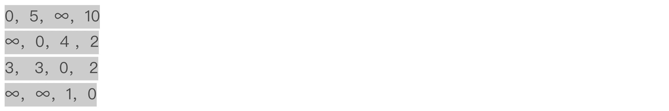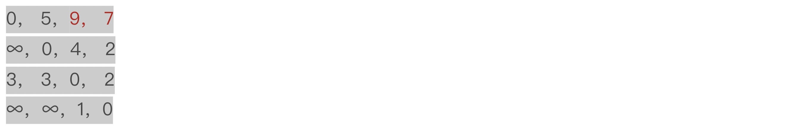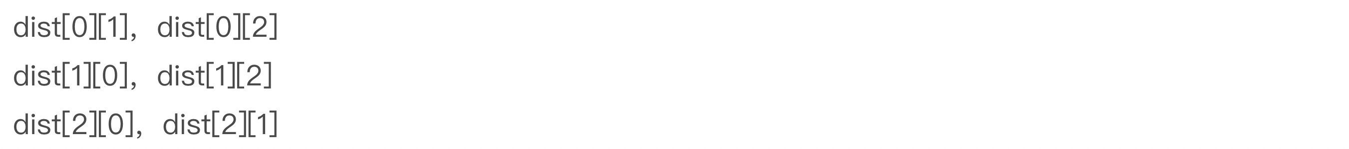 设置一个叫做dist的二维数组,用于存储图中任意两个顶点之间当前的最短路径长度信息,这个二维数组的起始内容就是该图相关的邻接矩阵信息,如下: