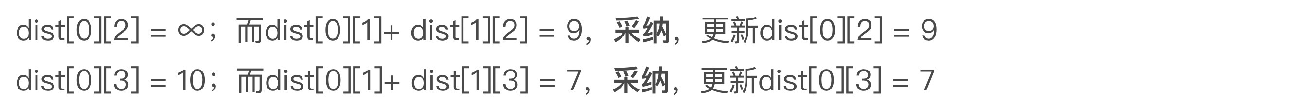 dist[1][2] = 4;而dist[1][0]+ dist[0][2] = ∞,忽略(后续忽略的将不再写出)。