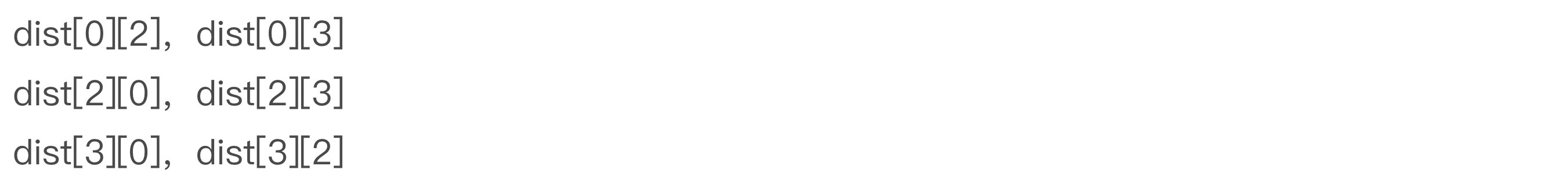 然后,把图中第四个顶点D(下标为3,即v=3)加入到有向图中,考察加入顶点D之后,任意两个顶点之间的距离会不会因为顶点D的加入而变得比原来更短。根据弗洛伊德算法描述中的前提条件i≠j并且v≠i,v≠j,dist数组中满足这个条件的成员只有如下6个: