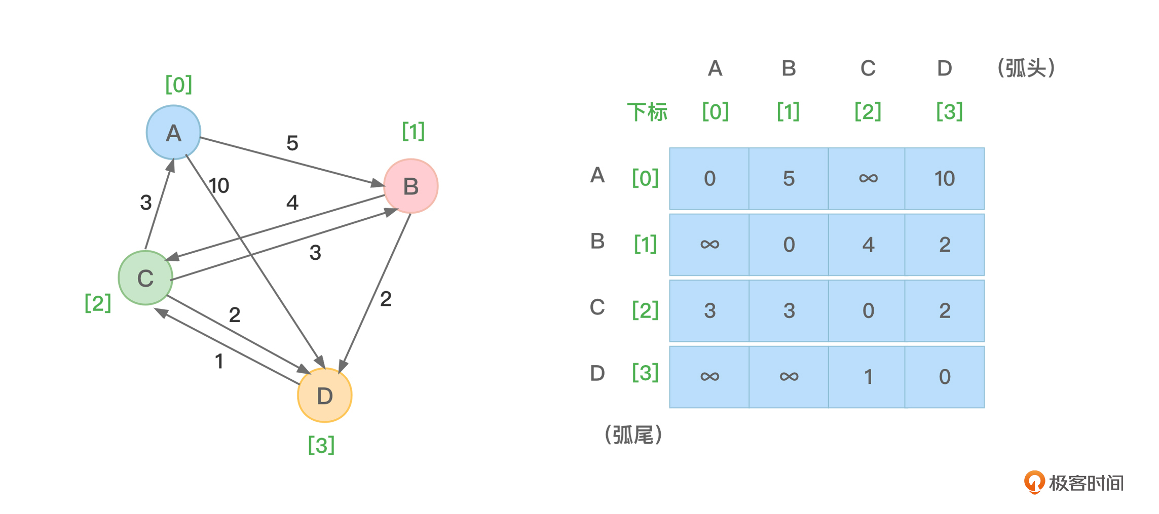 这里以图1所示的带权值有向图为例来讲解这个算法。图中同时展示了存储图中数据的邻接矩阵,为描述方便,我也标示出了每个顶点对应的下标。