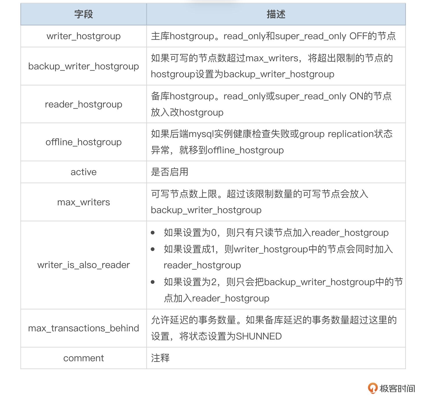 1 2 3 4 5 6 7 8 insert into mysql_group_replication_hostgroups (writer_hostgroup, backup_writer_hostgroup, reader_hostgroup, offline_hostgroup, active, max_writers, writer_is_also_reader, max_transactions_behind, comment) values(500, 502, 501, 503, 1, 1, 0, 0, 'mysql mgr cluster 1'); load mysql servers to runtime; save mysql servers to disk;