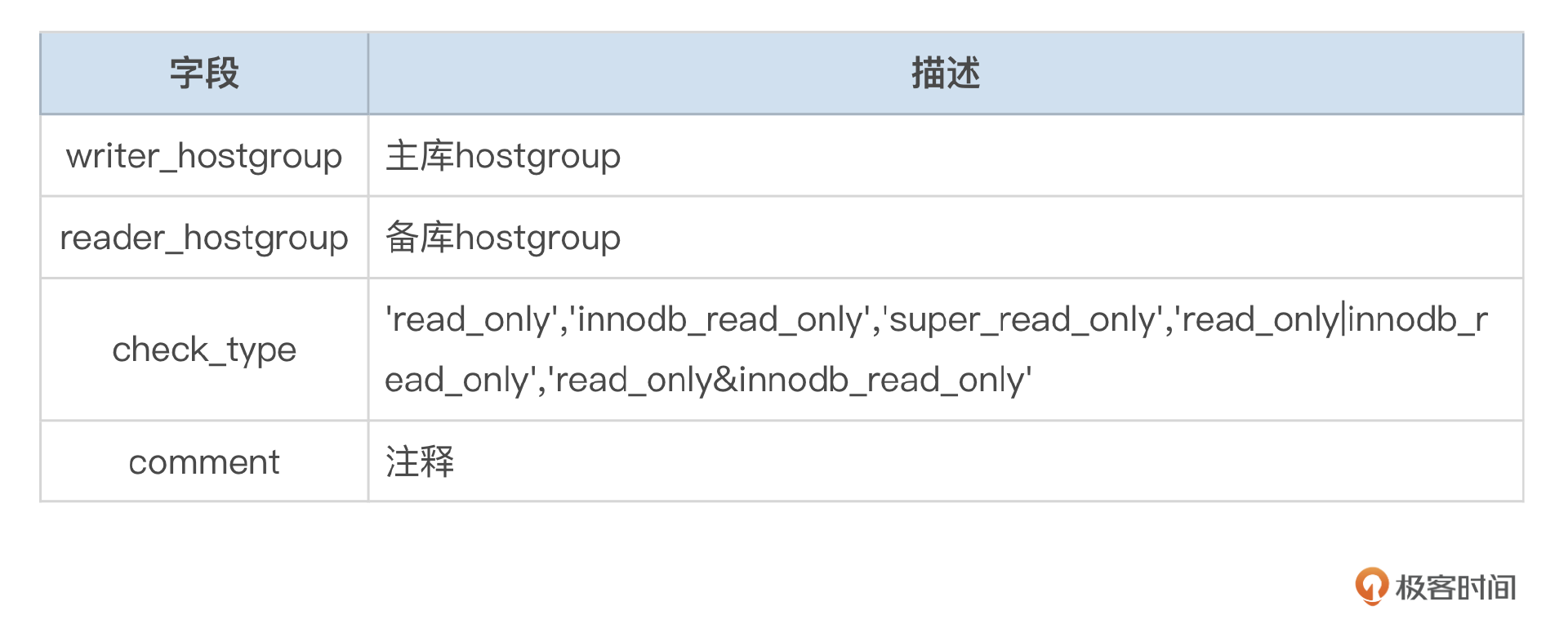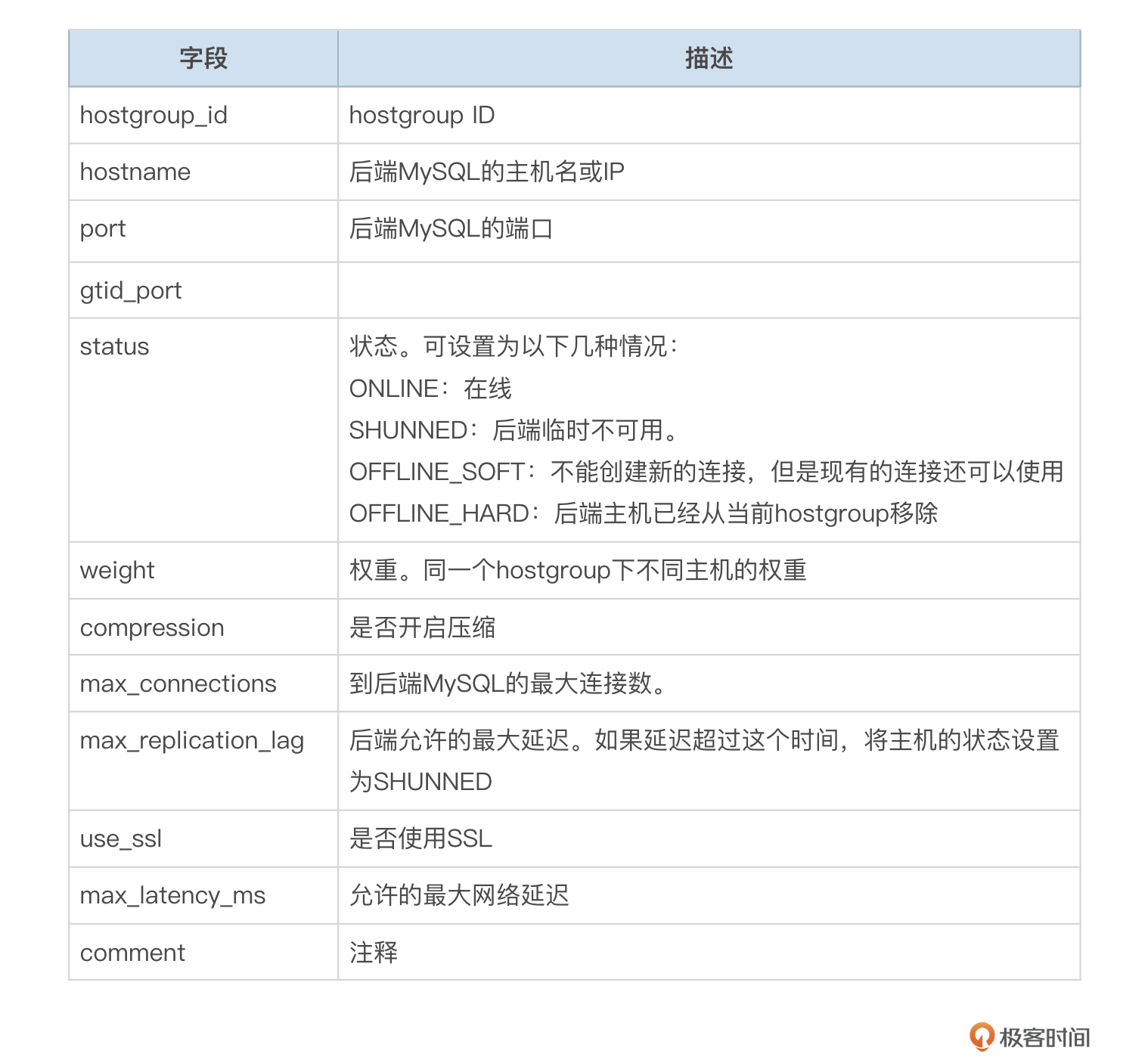 ProxySQL配置表参考 ProxySQL的配置主要通过一些配置表来实现。这里我对文章中用到的几个配置表做一个简单的说明,方便你查看。更详细的信息,你可以看官方文档 。