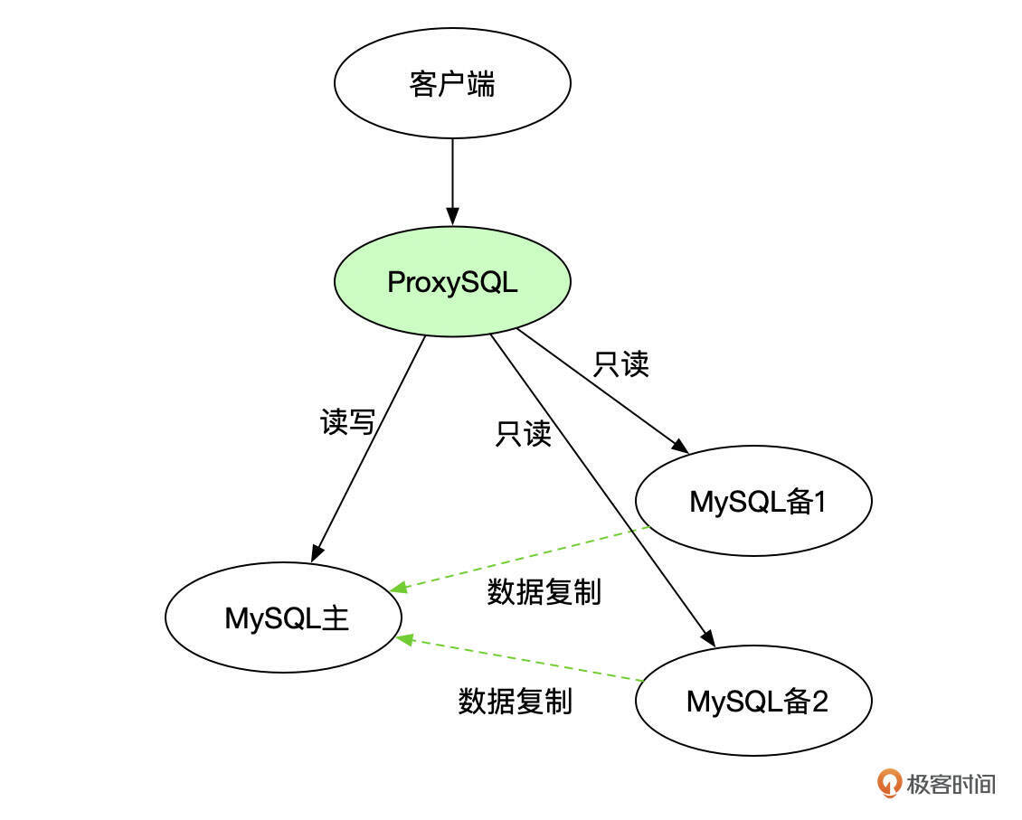 应用通过域名访问数据库。域名指向主库,当后端数据库发生主备切换后,将域名指向新的主库。使用域名存在几个问题,包括域名缓存的问题,以及端口的问题。因为域名只能解析到IP,如果主库和备库的端口不一样,就无法直接通过切换域名来解决。 在客户端解决。将MySQL集群中的实例信息都配置到应用程序中,在应用程序中自动检测主库和备库信息。也可以引入一些客户端的SDK来实现高可用。使用客户端的方案,会给应用开发带来额外的编码工作,或者对程序的开发语言有要求。 引入Proxy,应用程序只访问Proxy。Proxy内部自动识别主库,将应用的请求转发给正确的后端数据库。这里Proxy的作用,和在web高可用架构中的负载均衡器作用类似。使用Proxy的好处,一是对客户端的限制少,你可以使用熟悉的方式访问数据库。而且有的Proxy可以通过一些策略,实现读写分离、SQL黑名单和白名单、SQL改写等功能。 业界MySQL Proxy的产品比较多。这一讲中,我们就以开源的ProxySQL为例,来看一下数据库高可用的一种实现方式。