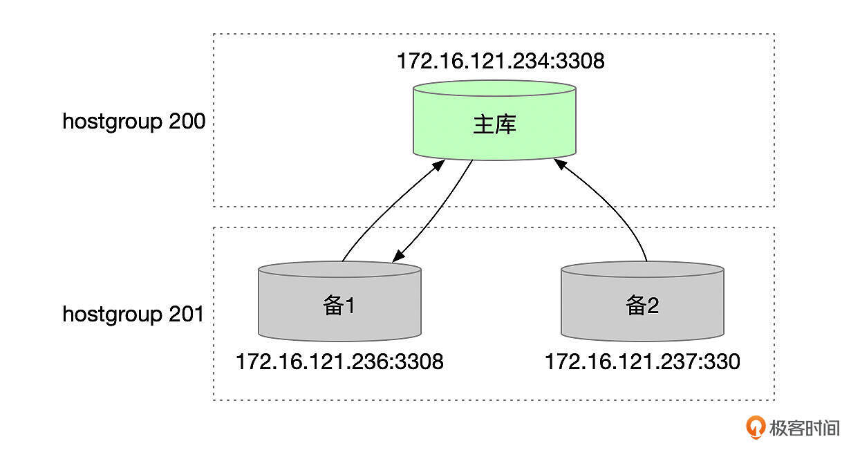 场景2:后端MySQL自动切换 上一个场景中,所有的写入都转发到hostgroup 200。如果后端的数据库发生了主备切换,怎么将写请求转发到新的主库呢?