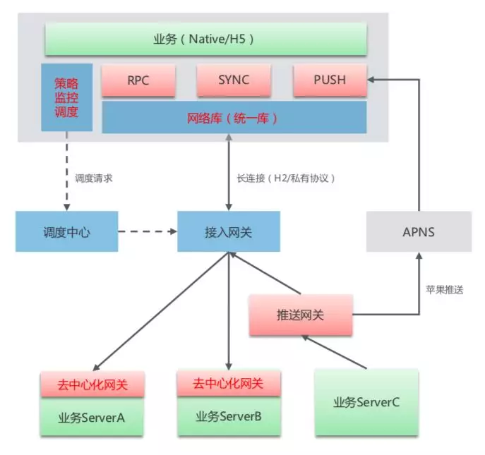 下图是mPaaS的网络架构图,所有网络请求都会先经过统一的接入层,再转发到业务服务器。这样我们可以在业务服务器无感知的情况下,在接入层做各种各样的网络优化。