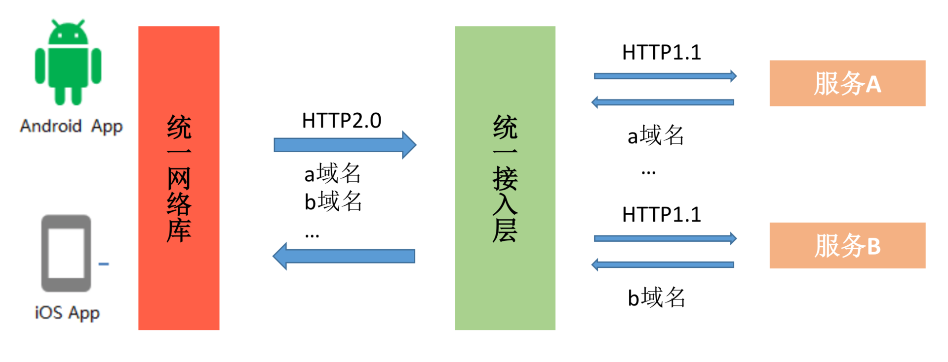 虽然H2十分强大,不过这里还有两个问题需要解决。一个是同一条H2连接只支持同一个域名,一个是后端支持HTTP/2.0需要额外的改造。这个时候我们只需要在统一接入层做改造,接入层将数据转换到HTTP/1.1再转发到对应域名的服务器。