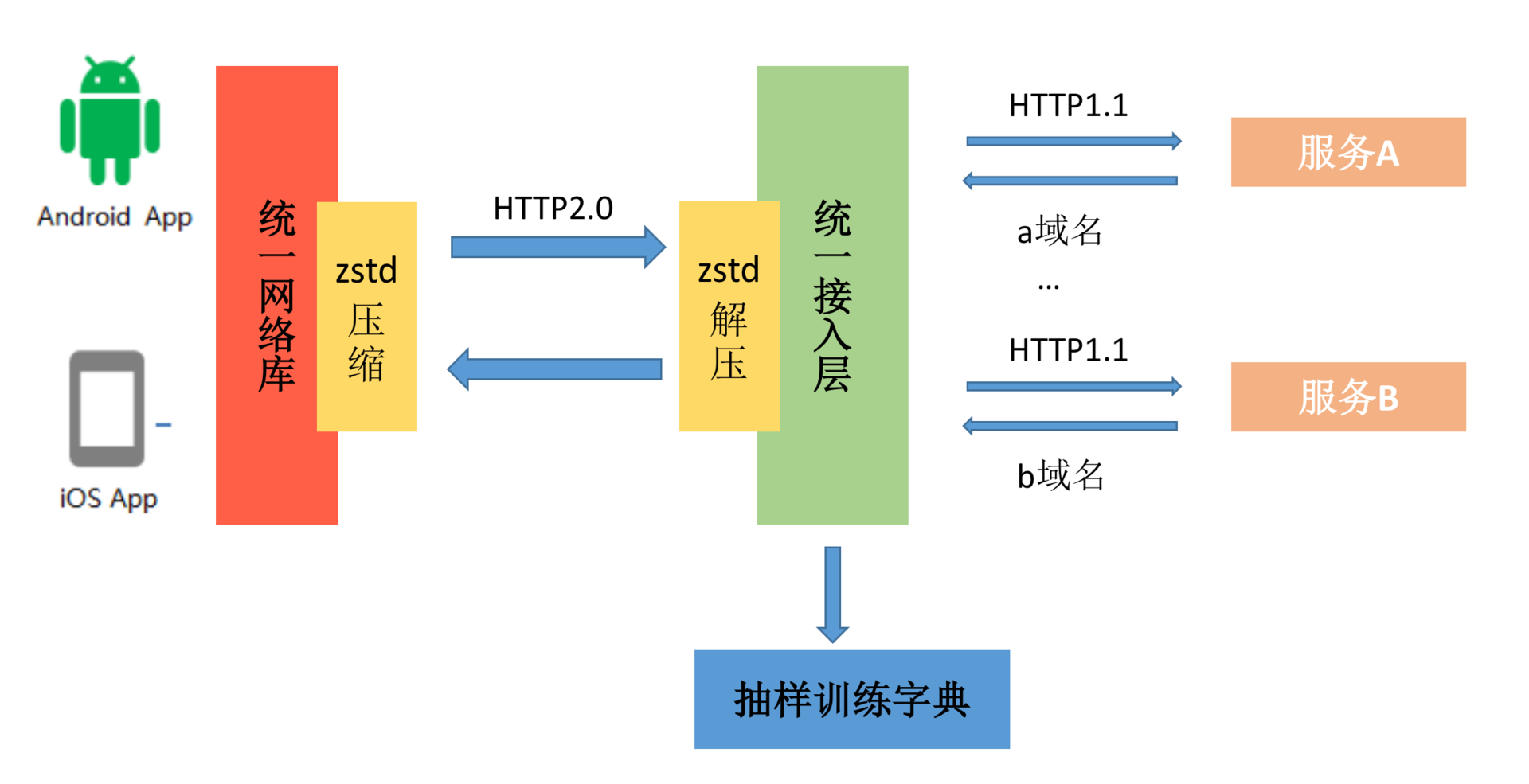 例如我们可以抽样1%的请求数据用来训练字典,字典的下发与更新都由统一接入层负责,业务并不需要关心。