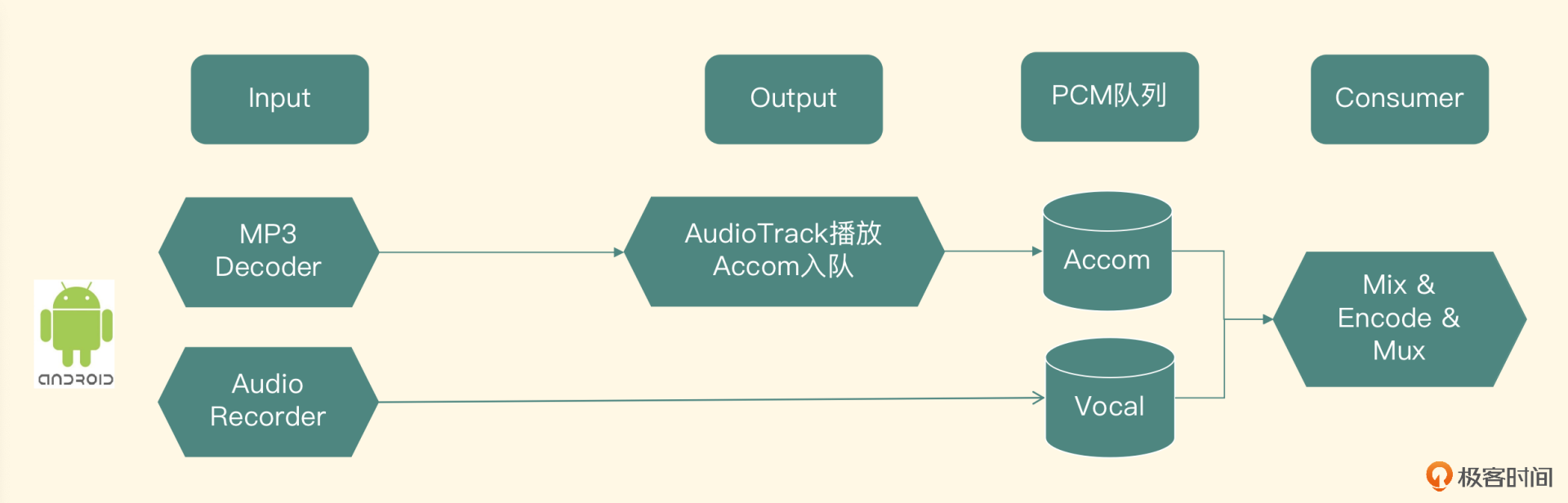 - Input代表输入模块,输入之一是麦克风,用来采集用户的声音;第二个是伴奏文件的解码器,用来解码用户选择的背景音乐,所以输入模块要由这两部分共同来实现。