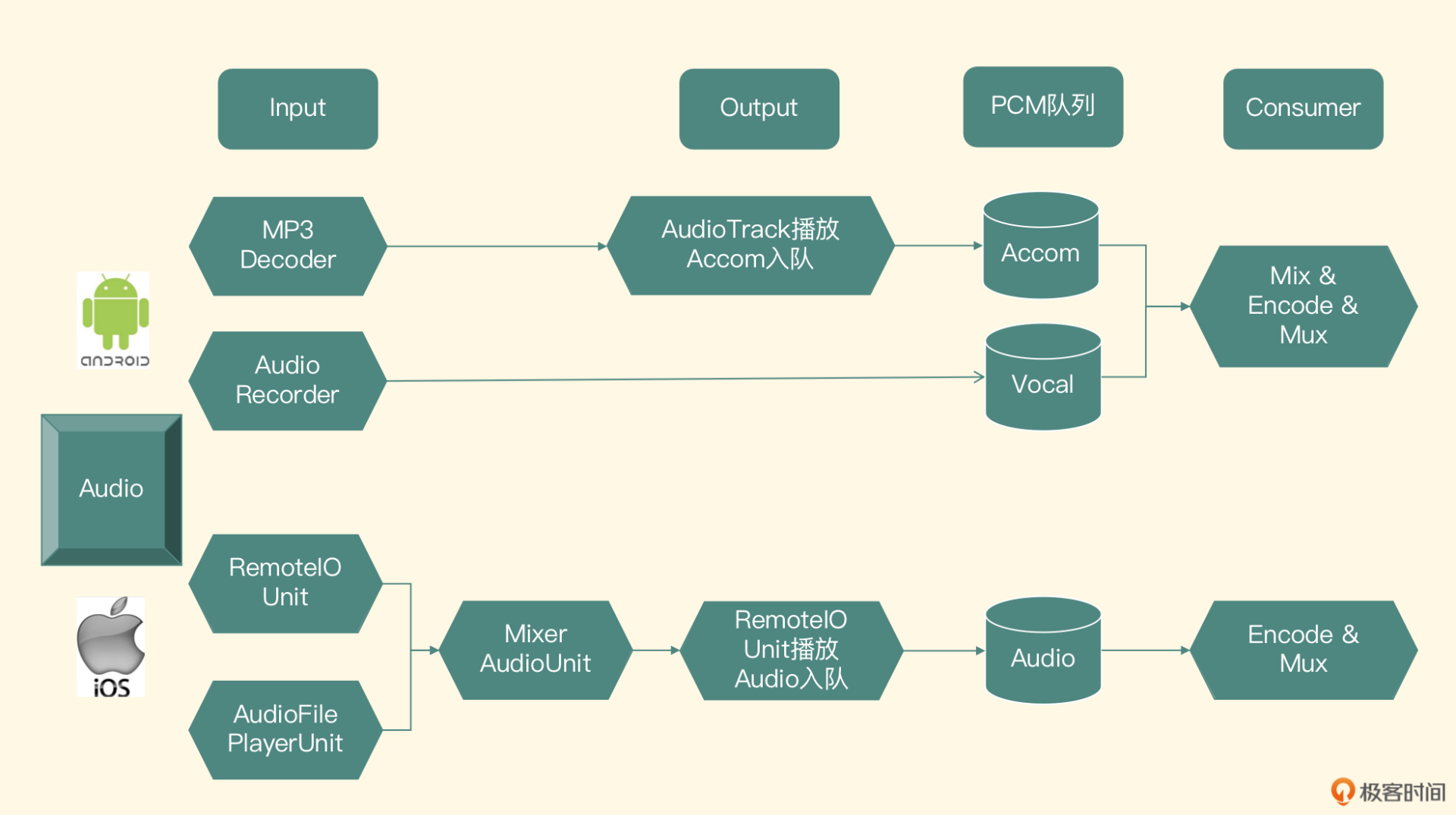 乍一看,你可能会觉得这个架构比较复杂,因为图里包含了两个平台的音频架构,同时链路里还包括了BGM的播放。不过,你别着急,我会带你来逐一分析。