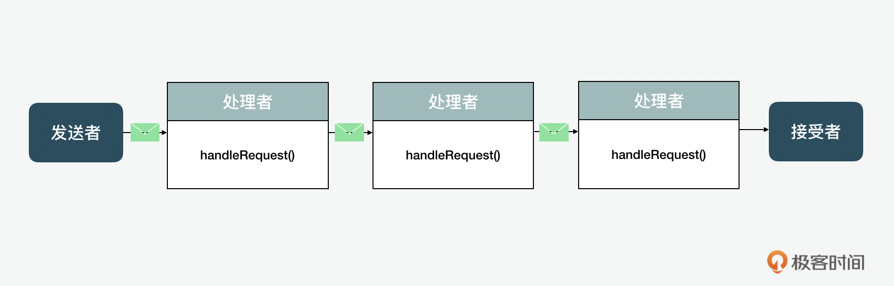 职责链模式 最后,再来看下职责链模式,职责链模式(chain of responsibility)核心是将请求的发送者和接收者解耦 。它的实现是通过一个对象链,链中的每个对象都可以处理请求或将其传递给下一个对象。其实在我们前面讲享元时,就提到过事件捕获和冒泡,JavaScript 内部就是用这个方式来处理事件捕获和冒泡的。同样在享元例子中,我们也提到过,jQuery 是通过职责链每次返回一个对象来做到的链接式调用。