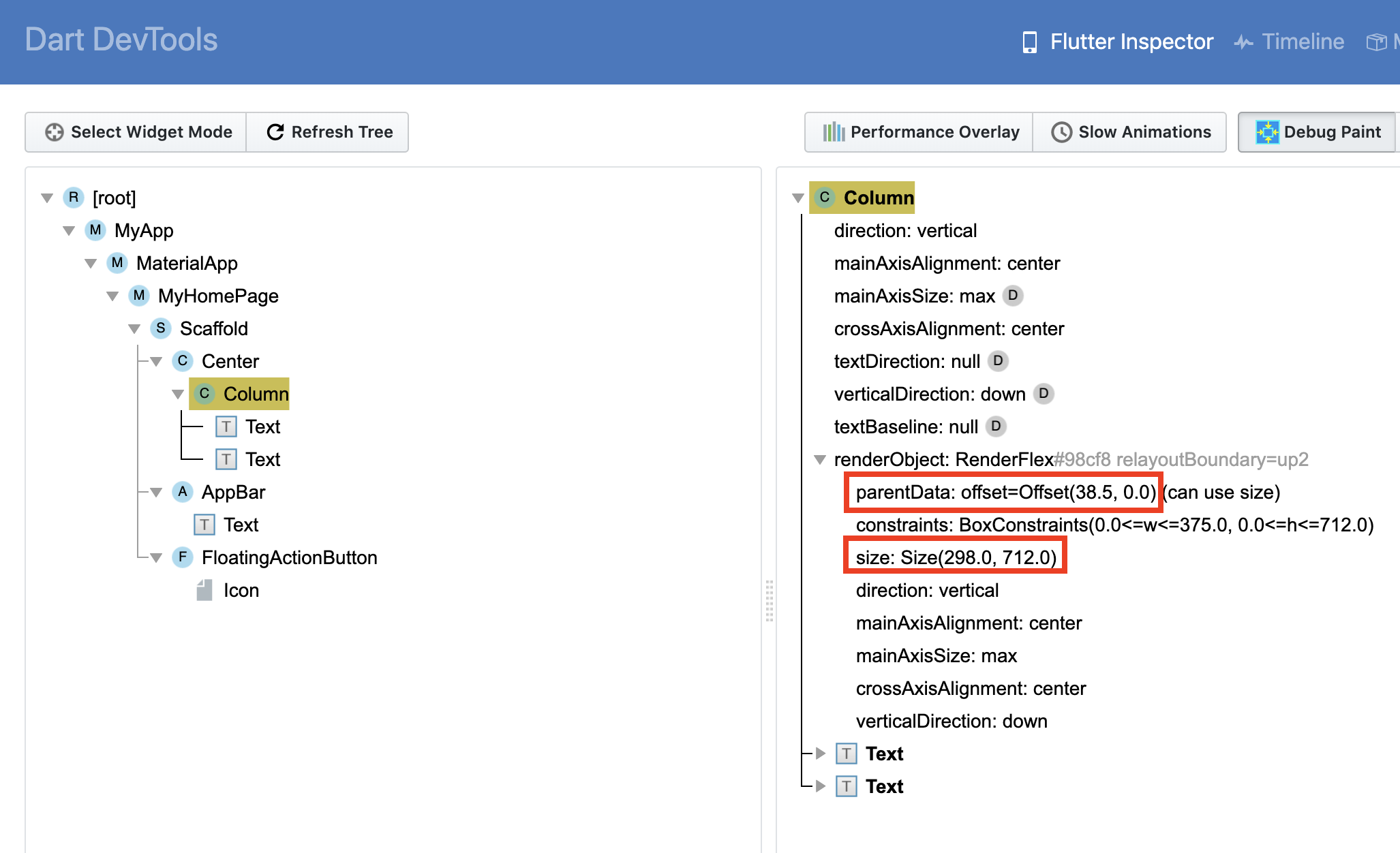 然后,我们将Flutter Inspector面板左侧选择的控件更新为Column,右侧也更新了它的具体视觉信息,比如排版方向、对齐模式、渲染信息,以及它的两个子Widget-Text。