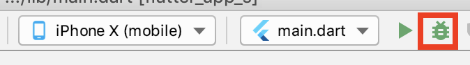**接下来则是调试应用了。**和之前通过点击run按钮的运行方式不同,这一次我们需要点击工具栏上的虫子图标,以调试模式启动App,如下图所示:
