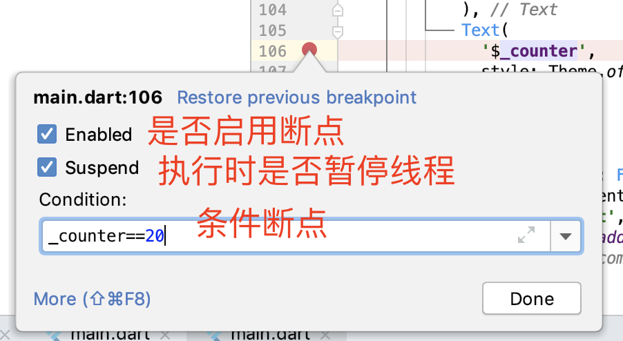 在下图的例子中,我们为了观察_counter在等于20的时候是否正常,还特意设置了一个条件断点_counter==20,这样调试器就只会在第20次点击计数器按钮时暂停下来: