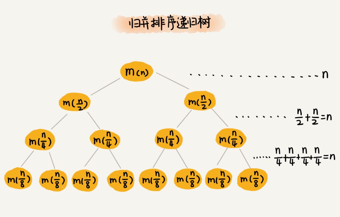 归并排序的原理我就不详细介绍了,如果你忘记了,可以回看一下第12节的内容。归并排序每次会将数据规模一分为二。我们把归并排序画成递归树,就是下面这个样子: