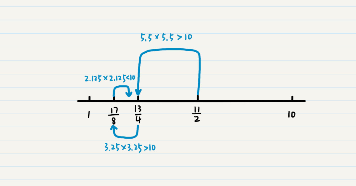 举个例子,假如我们要找到10的平方根。我们需要先看1到10的中间数值,也就是11/2=5.5。5.5的平方是大于10的,所以我们要一个更小的数值,就看5.5和1之间的3.25。由于3.25的平方也是大于10的,继续查看3.25和1之间的数值,也就是2.125。这时,2.125的平方小于10了,所以看2.125和3.25之间的值,一直继续下去,直到发现某个数的平方正好是10。