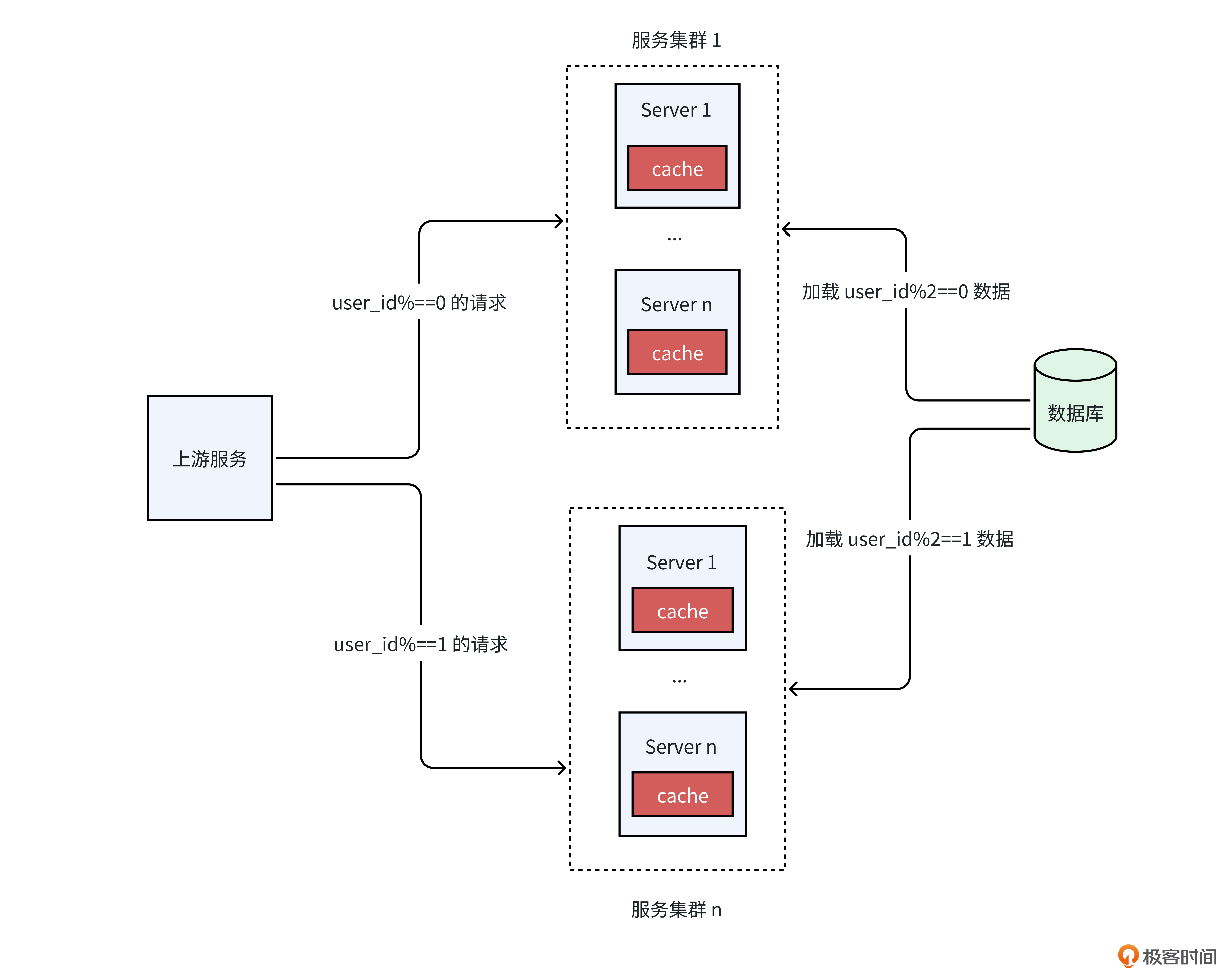比如,就像下面的图一样,我们可以将服务拆分成两个集群,集群1加载user_id模2为0的数据,集群2加载user_id模2为1的数据。然后上游服务根据请求的user_id,请求我们的不同集群。通过这种方式,我们能够有效减少单个服务实例所需加载的数据量。