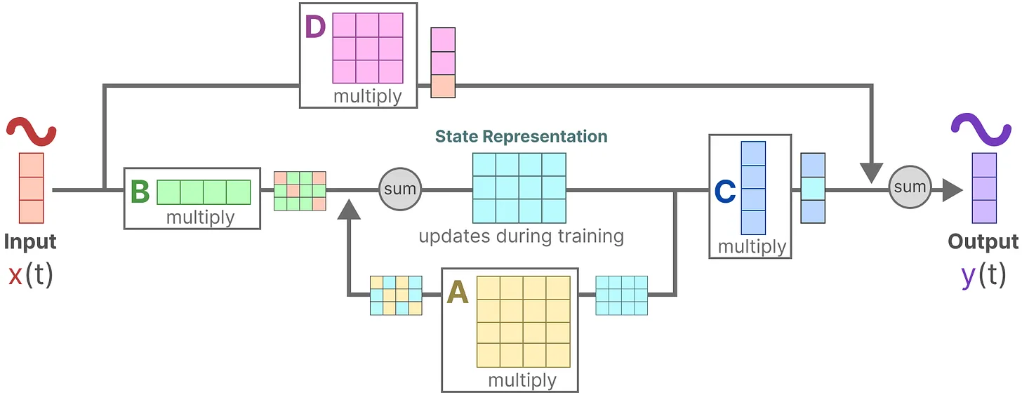 注意:矩阵A、B、C 和 D 就是我们常说的参数,它们是可学习的。