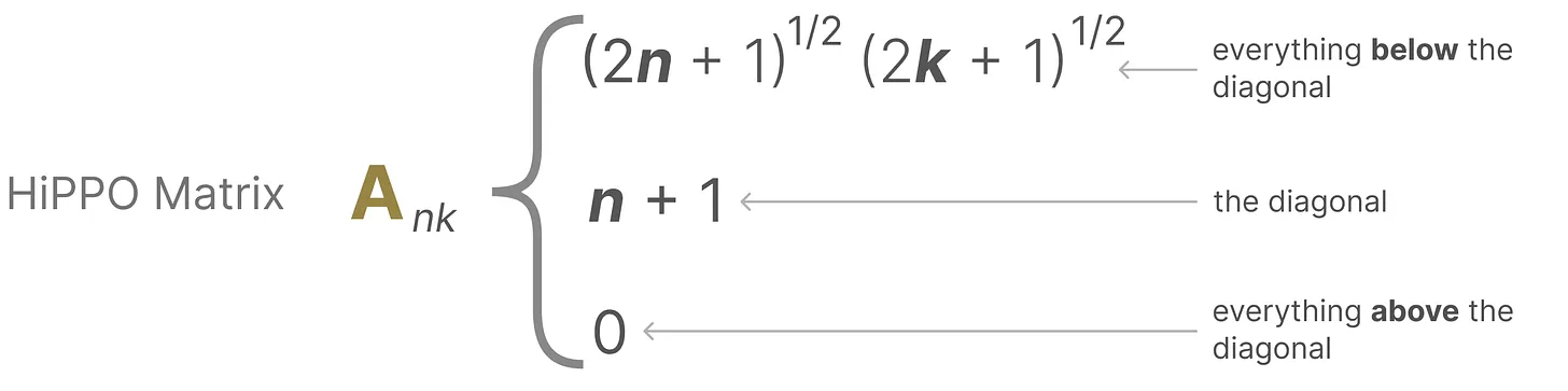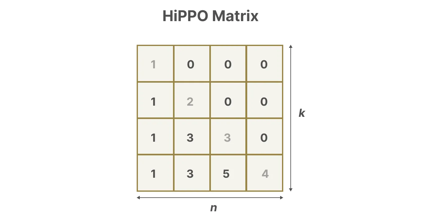 因此矩阵A的创建自然不能随机产生,我们希望他能包含历史信息,也就是上下文信息,Mamba使用HiPPO创建矩阵A,关于HiPPO的解释,简单来看,就是一种通过多项式来进行历史信息循环记忆的方法,你可以阅读 HiPPO 论文了解更详细的信息。HiPPO矩阵计算公式为: