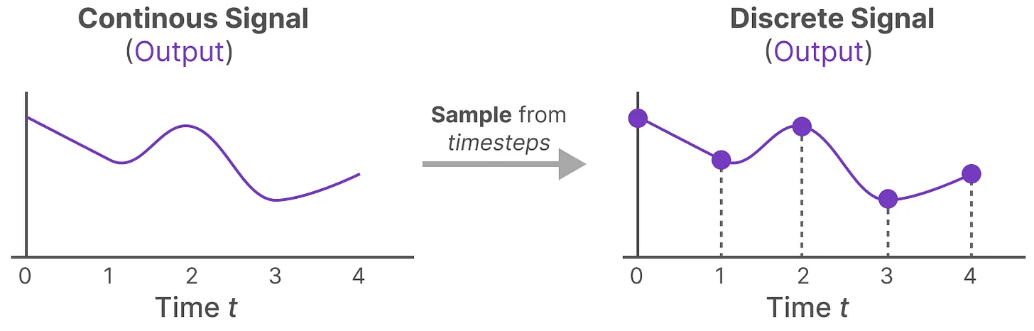 具体指保留多长时间,是一个可学习的参数,称为步长,我们用$\Delta$表示。有了连续的输入信号,我们可以生成连续的输出,并且仅根据输入的时间步长$\Delta$对值进行采样,这些采样值就是我们的离散输出。