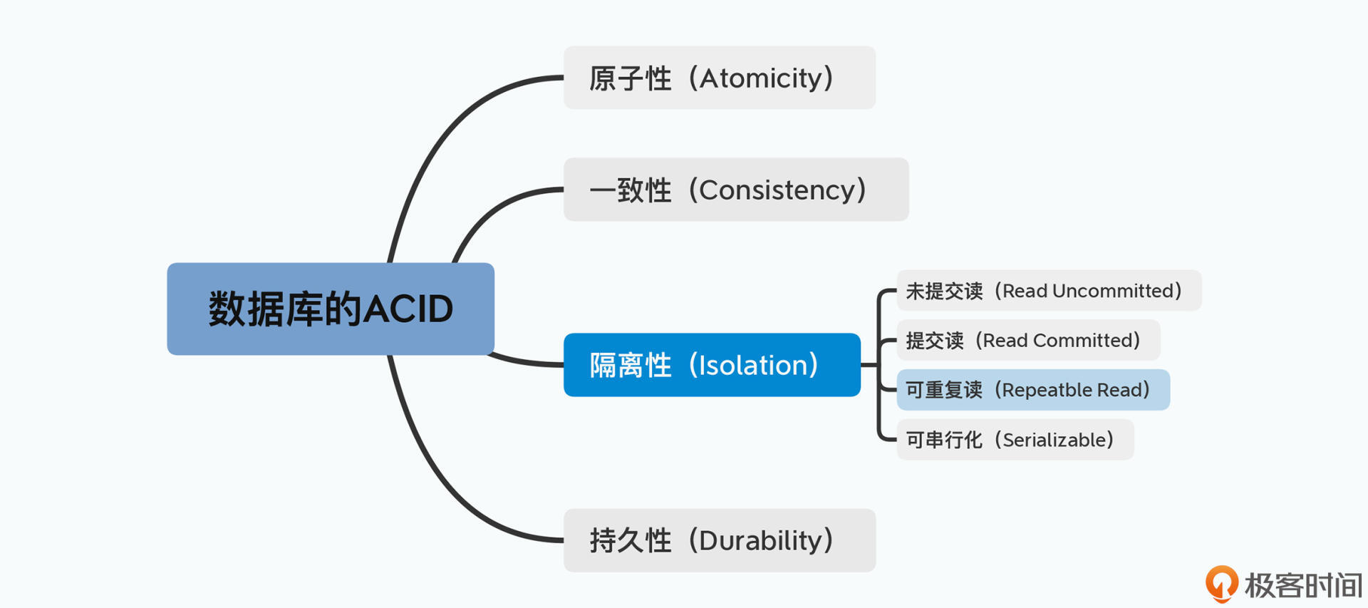 这节课,我们先一起来看了一下数据库事务的ACID特性,也就是原子性、一致性、隔离性和持久性。而我们真正关注的,是里面的隔离性。