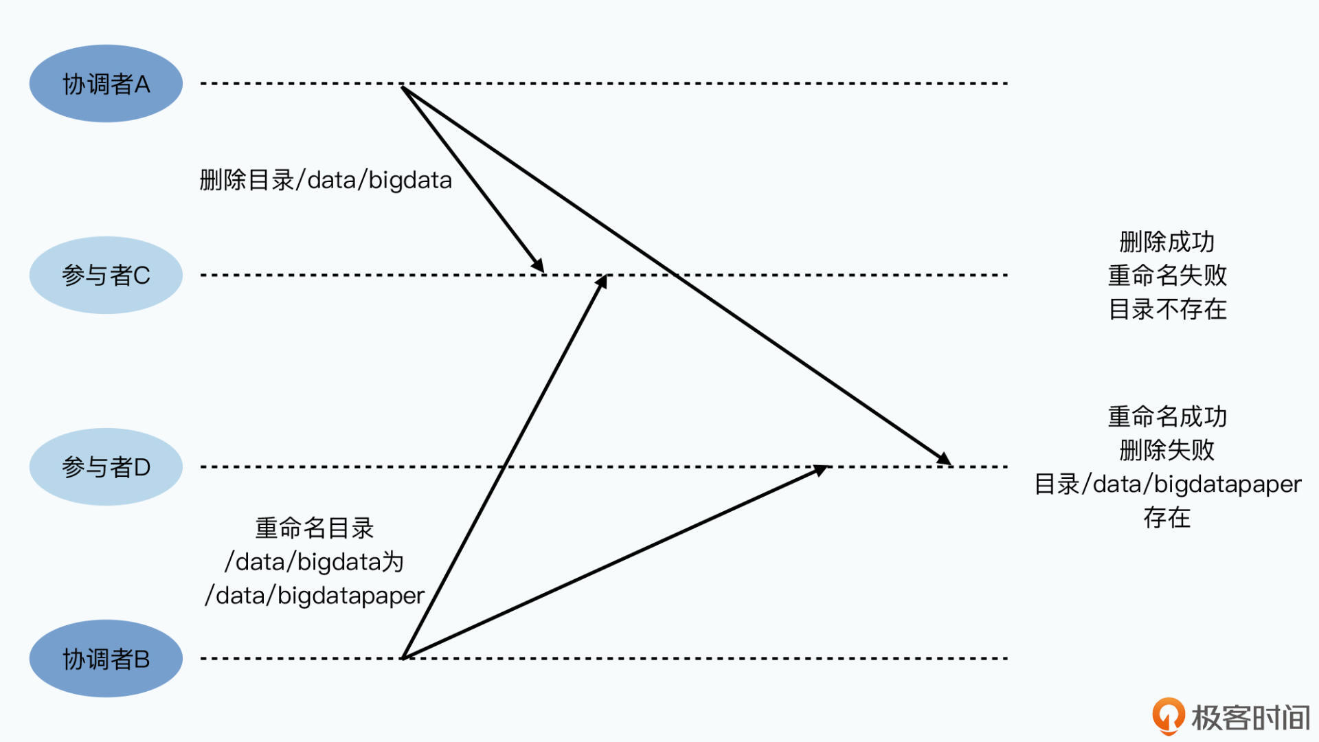 最容易发生的问题,是操作顺序的错乱。我们以两个协调者A和B,以及两个参与者C和D为例,如果A要在C和D上,删除目录/data/bigdata,而B则是要在C和D上,把目录/data/bigdata改名成/data/bigdatapaper。因为是分布式的网络环境,那么可能会出现在C这里,A的请求先到,B的请求后到,/data/bigdata的目录已经被删除了,所以改名也失败了;而在D这里,两个顺序是反过来的,那么D这里的/data/bigdata目录已经改名成功,而删除则失败了。C和D之间的数据也就不一致了。