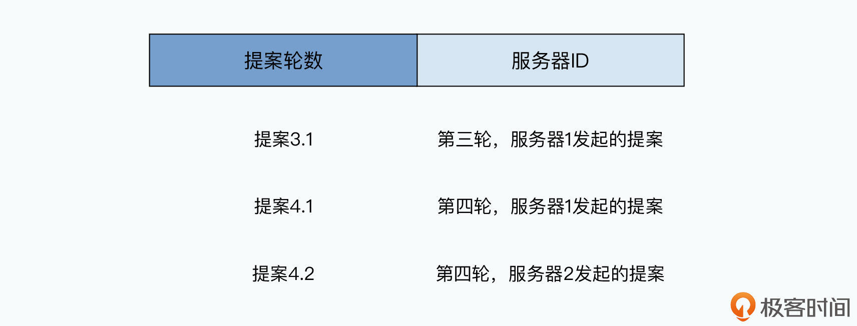 首先是每一个请求,我们都称之为一个“提案”。然后每个提案都有一个编号,这个编号由两部分组成。高位是整个提案过程中的轮数(Round),低位是我们刚才的服务器编号。每个服务器呢,都会记录到自己至今为止看到过,或者用到过的最大的轮数。