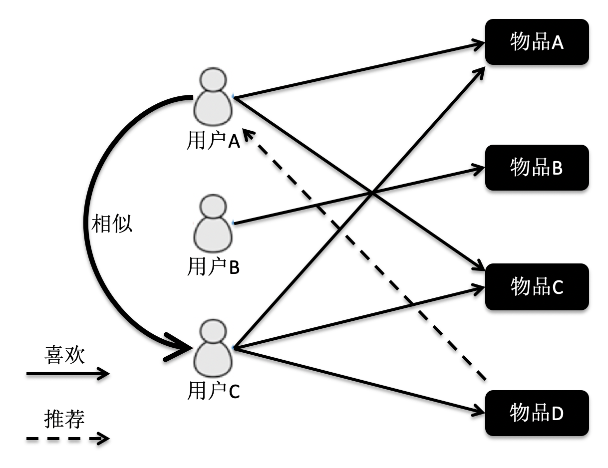 在这张图中,物品A和C因为都被用户A和B同时访问,因此它们被认为相似度更高。当用户C访问过物品A后,系统会更多地向用户推荐物品C,而不是其他物品。
