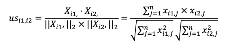 我们可以使用向量空间模型中的距离或者是夹角余弦来处理,在这里我使用了夹角余弦,其中$us_{i1}$,$i2$表示用户$i1$和$i2$的相似度,而$X_{i1}$,表示矩阵中第$i1$行的行向量,$X_{i2}$,表示矩阵中第$i2$行的行向量。分子是两个表示用户的行向量之点乘,而分母是这两个行向量$L2$范数的乘积。