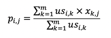 第二个公式利用第一个公式所计算的用户间相似度,以及用户对物品的喜好度,预测任一个用户对任一个物品的喜好度。其中$p_{i,j}$表示第$i$用户对第$j$个物品的喜好度,$us_{i,k}$表示用户$i$和$k$之间的相似度,$x_{k,j}$表示用户$k$对物品$j$的喜好度。注意这里最终需要除以$Σus_{i,k}$,是为了进行归一化。