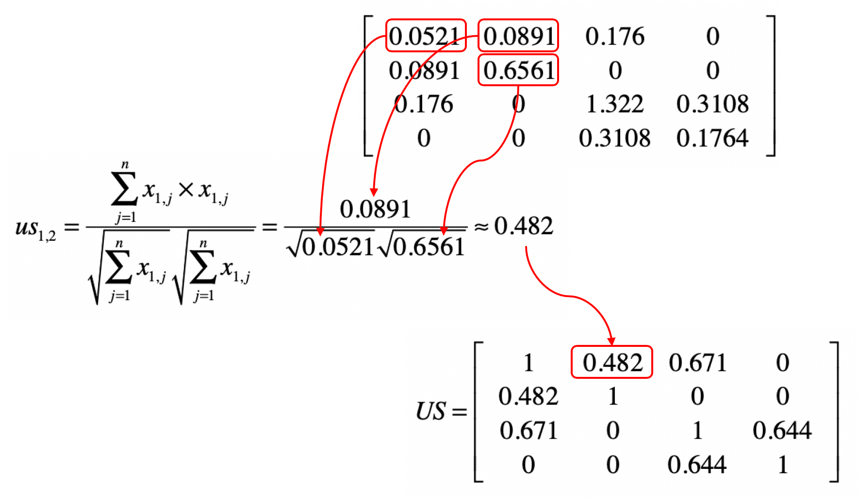 然后我们使用$Y$来计算$US$。我用下面这张图表示矩阵中的元素和夹角余弦计算的对应关系。