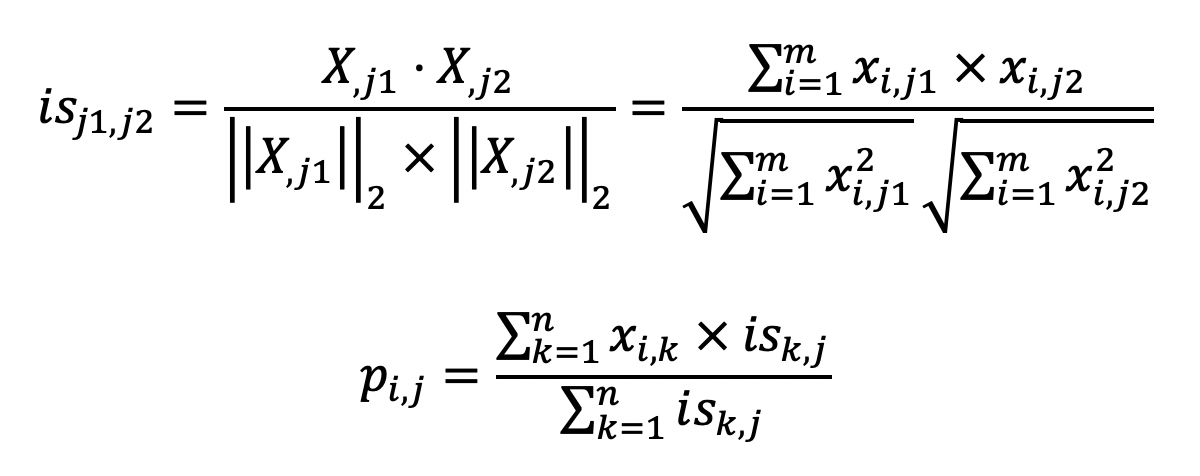 如果你弄明白了基于用户的过滤,那么这两个公式也就不难理解了。第一个公式的核心思想是计算物品和物品之间的相似度,在这里我仍然使用夹角余弦。其中$is_{j1}$,$j2$表示物品$j1$和$j2$的相似度,而$X_{j1}$表示了$X$中第$j1$列的列向量,而$X_{j2}$表示了$X$中第$j2$列的列向量。分子是两个表示物品的列向量之点乘,而分母是这两个列向量$L2$范数的乘积。