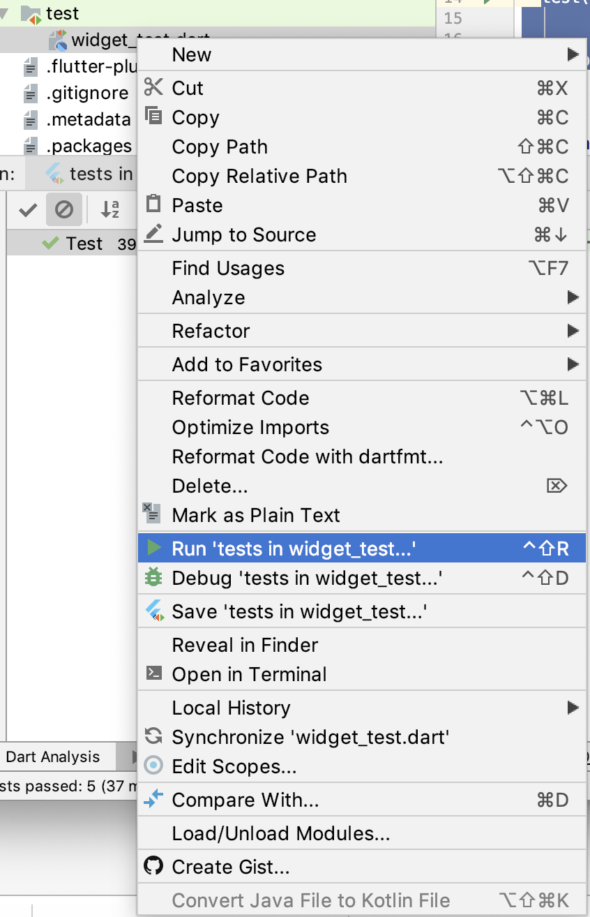 选择widget_test.dart文件,在右键弹出的菜单中选择“Run ‘tests in widget_test’”,就可以启动测试用例了。