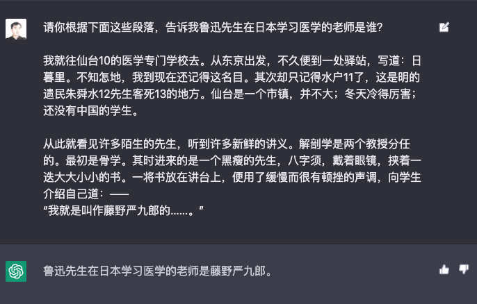 我在这里,也给了你一个例子的截图。当我们把《藤野先生》里的两个段落给到AI,然后请AI根据这两个段落,回答原来那个问题,就会得到正确的答案,你也可以去看一看。