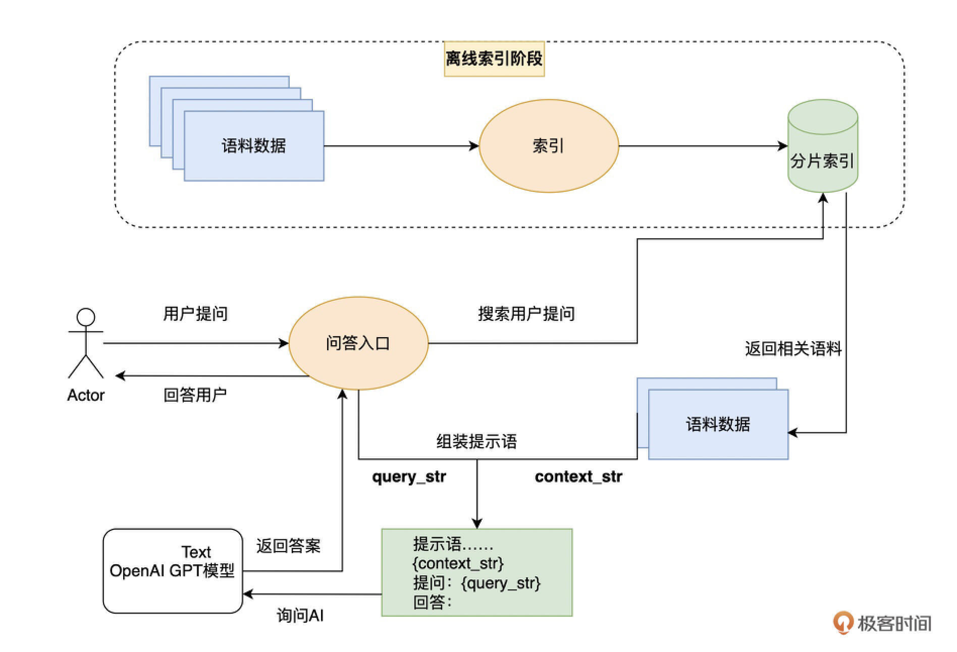- 我们先通过搜索的方式,找到和询问的问题最相关的语料。这个搜索过程中,我们既可以用传统的基于关键词搜索的技术,也可以用第 9 讲我们刚刚介绍过的使用Embedding的相似度进行语义搜索的技术。